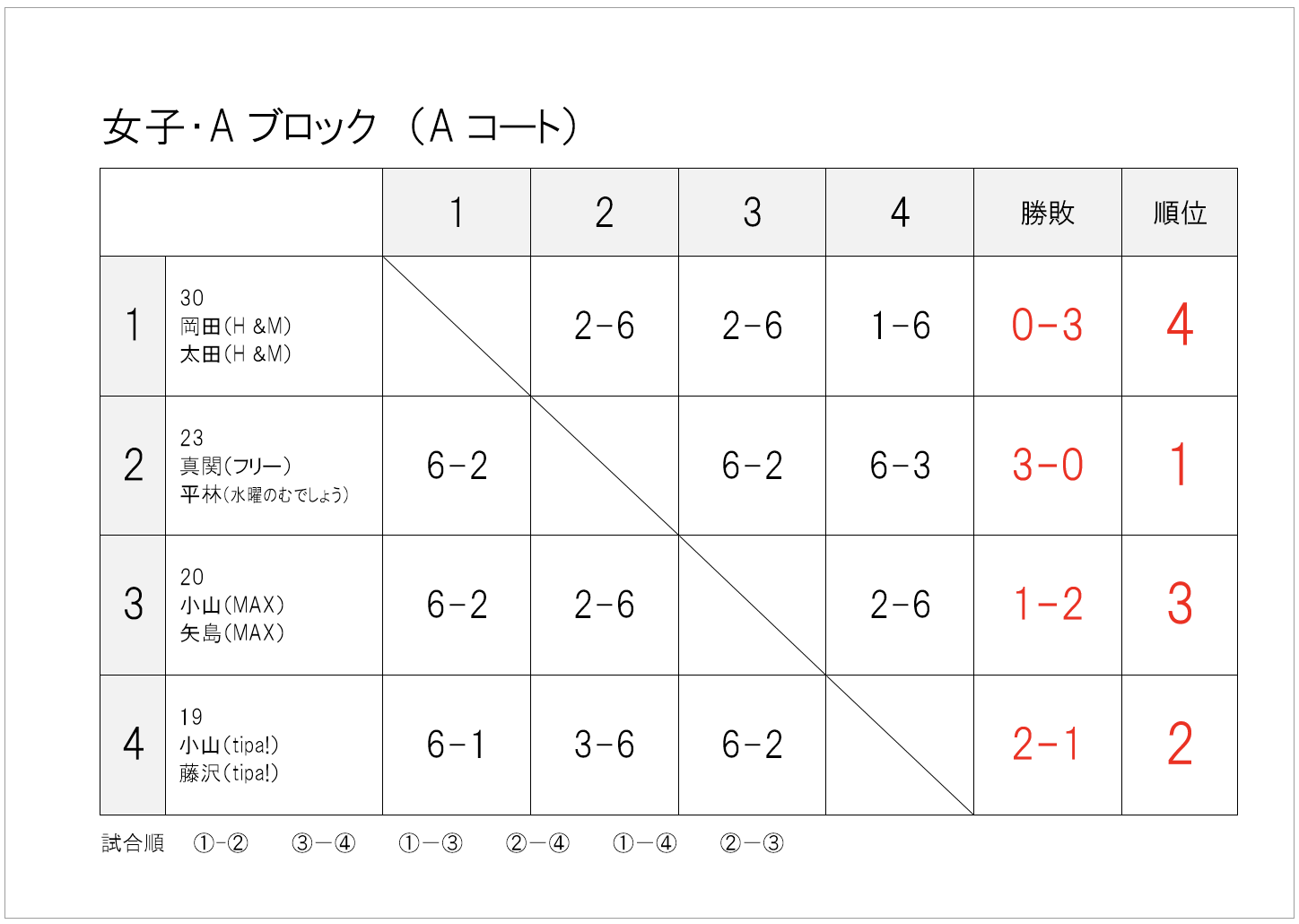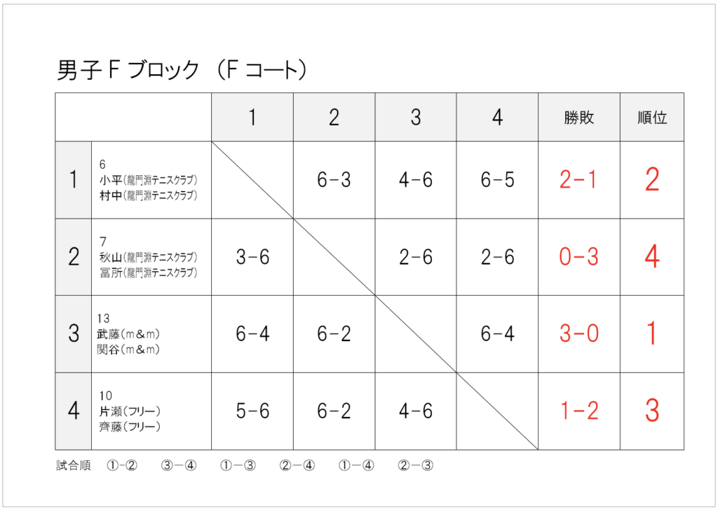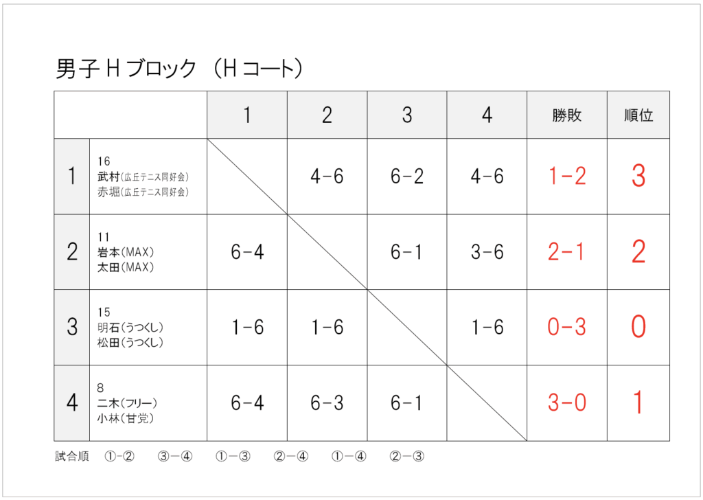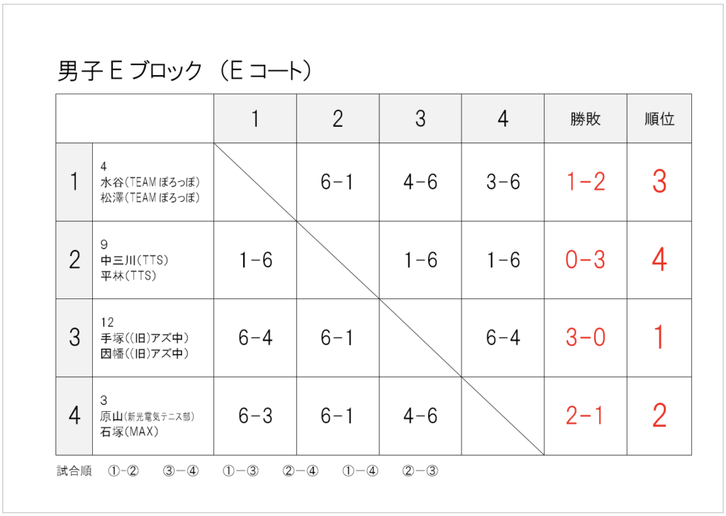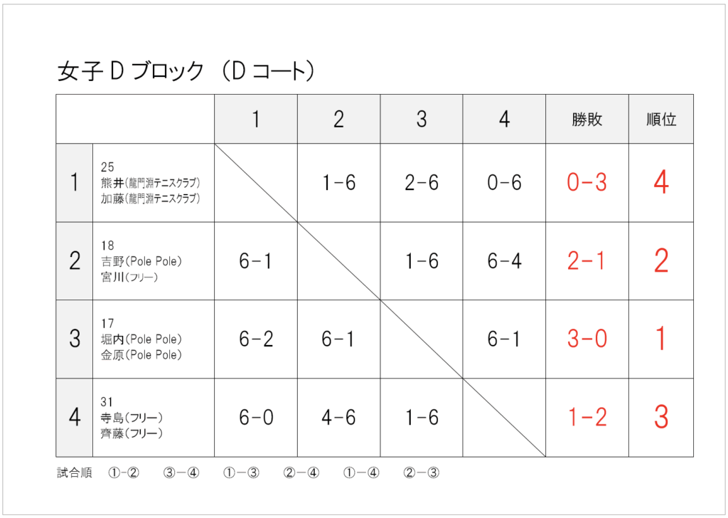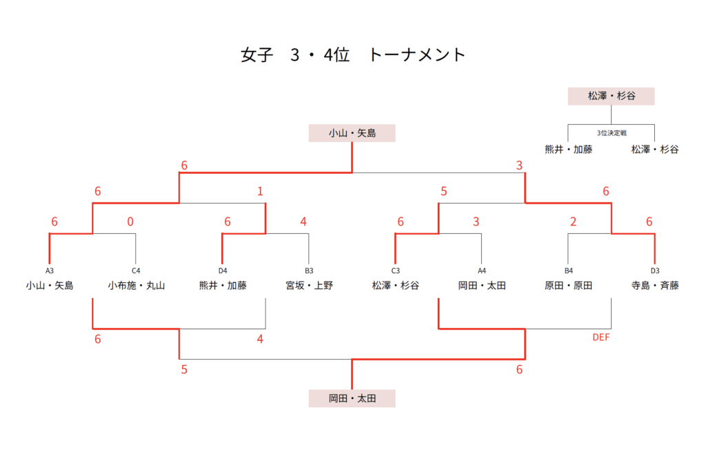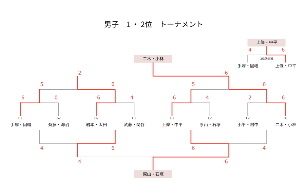 — infomation, 大会情報 — 2025年_春季大町庭協杯・結果 2025年5月19日 試合方法少し変更して行いました。暑さや花粉に苦しんだ1日でしたね。 1・2位トーナメント1位 1・2位トーナメント2位 1・2位トーナメント3位 1・2位コンソレーション1位 3・4位トーナメント1位 3・4位トーメント2位 3・4位トーナメント3位 3・4位コンソレーション1位 1・2位トーナメント1位 1・2位トーナメント2位 1・2位トーナメント3位 1・2位コンソレーション1位 3・4位トーナメント1位 3・4位トーナメント2位 3・4位トーナメント3位 3・4位コンソレーション1位 予選リーグ結果(クリックして拡大) 順位別トーナメント結果(クリックして拡大)